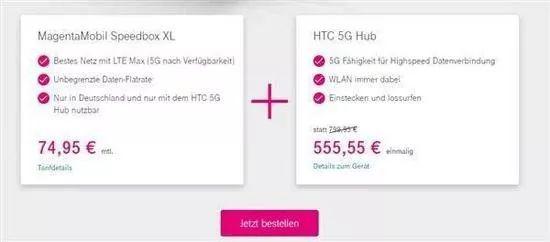2、捆綁的不是手機(jī),而是HTC 5G Hub(類似路由器,將5G網(wǎng)速接入后轉(zhuǎn)發(fā)出更多的設(shè)備可以接入體驗(yàn)高網(wǎng)速),售價(jià)555.55歐元,折合人民幣4305元,而這種套餐每月收費(fèi)74.95歐元,約合581元人民幣,套餐流量、電話、短信跟上面的一樣,不過(guò)上行速率是50Mbps。