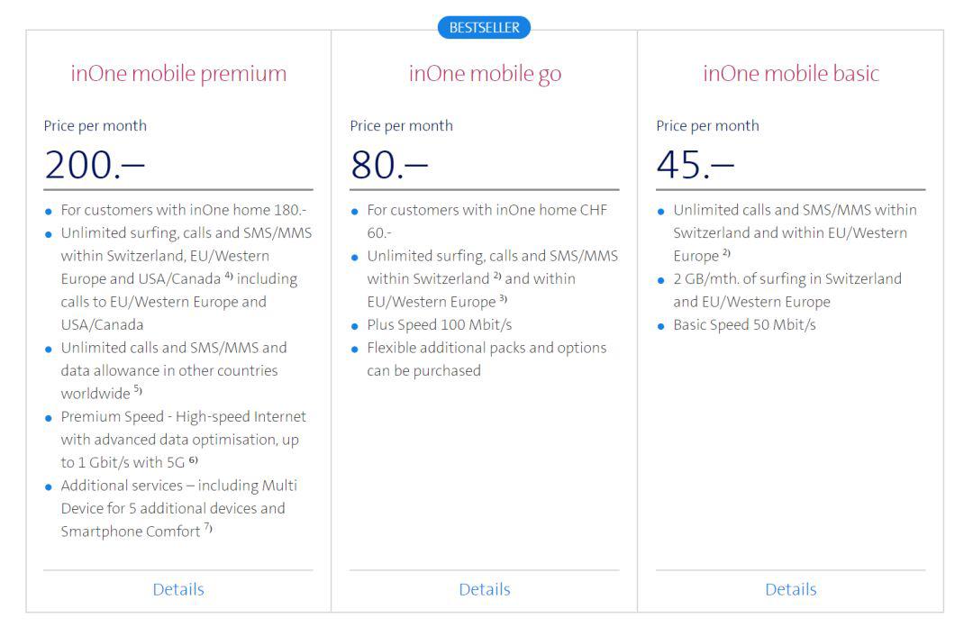 套餐價(jià)格與速度、附加服務(wù)相關(guān)。在Swisscom的inOen移動(dòng)計(jì)劃中,根據(jù)速度不同分為兩個(gè)檔次:100Mbps的“Plus Speed”和2Gbps的“Premium Speed”。從Plus升級(jí)到Premium每月多10法郎(約人民幣69.41元)。如下圖,中間無(wú)限流量套餐價(jià)格高達(dá)80法郎(約人民幣555.1元)。