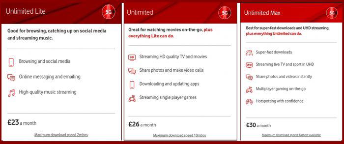 Vodafone的消費(fèi)用戶和企業(yè)用戶新5G服務(wù)套餐基本上和4G服務(wù)持平。沃達(dá)豐通過(guò)提供根據(jù)速度分層的無(wú)限下載,采用了不同的數(shù)據(jù)限額方法。目前Vodafone在英國(guó)地區(qū)共有三種套餐,分別為: