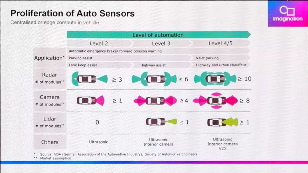 “自動駕駛級別每升高一級,對計算力的需求至少增加十倍,”Imagination汽車市場總監(jiān)Bryce Johnstone表示,“第五級全自動駕駛,可能需要每秒500萬億次(TOPS)以上計算力?!?