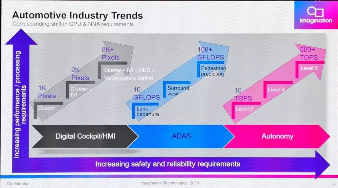 “自動駕駛級別每升高一級,對計算力的需求至少增加十倍,”Imagination汽車市場總監(jiān)Bryce Johnstone表示,“第五級全自動駕駛,可能需要每秒500萬億次(TOPS)以上計算力。”