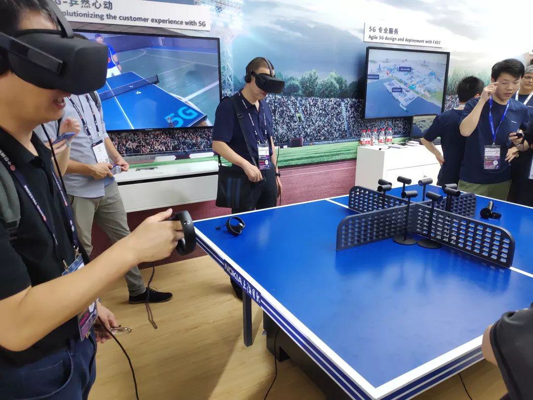 比如5G VR乒乓球,頭戴VR眼鏡,手握控制器,就能和虛擬人物對打,依舊離不開5G。