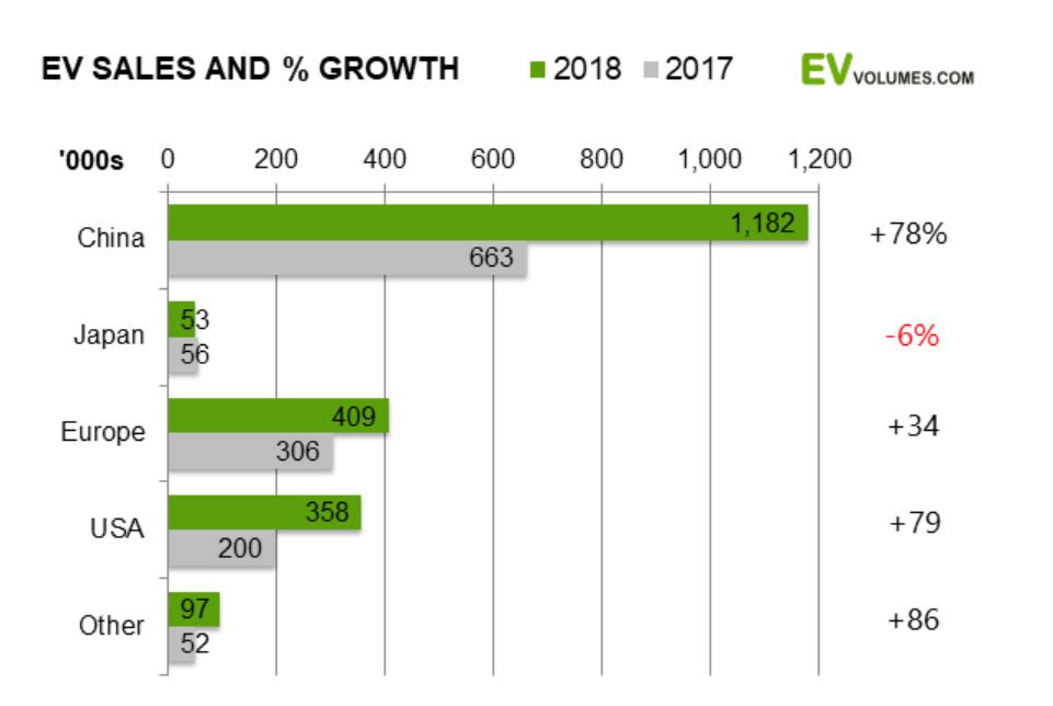2017-2018年全球主要地區(qū)新能源汽車銷量及增長(zhǎng)率
