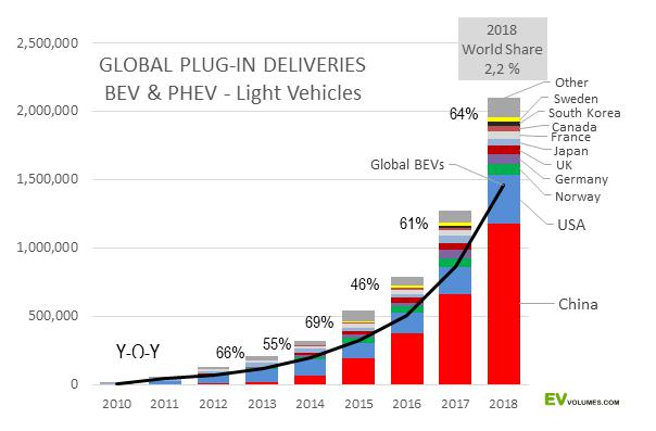截止2018年12月全球插電式乘用車庫(kù)存達(dá)到510萬(wàn)輛,其中包括330萬(wàn)輛全電動(dòng)汽車(65%)和180萬(wàn)輛插電式混合動(dòng)力汽車(35%)。BEV和PHEV之間的全球比例已經(jīng)轉(zhuǎn)向全電動(dòng)汽車,從2012年的56:44變?yōu)?015年的60:40,并在2018年升至69:31。然而盡管增長(zhǎng)飛速,但插電式電動(dòng)車市場(chǎng)在2018年底的世界道路上每250輛機(jī)動(dòng)車中只占1輛。電動(dòng)汽車要取代燃油汽車仍還有很長(zhǎng)的一段路要走。