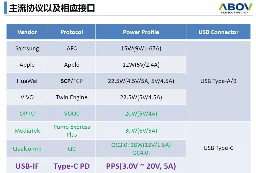 從目前的主流協(xié)議和接口看,三星、蘋果和華為都有自己的協(xié)議。OPPO VOOC、MTK PE、Qualcomm QC等各家的協(xié)議都是基于各自的充電器和線材,充電參數(shù)不一,導(dǎo)致整個市場非?;靵y。Type-C接口的推廣和成熟,USB PD目前兼容所有主流協(xié)議,有望形成行業(yè)統(tǒng)一充電規(guī)范。