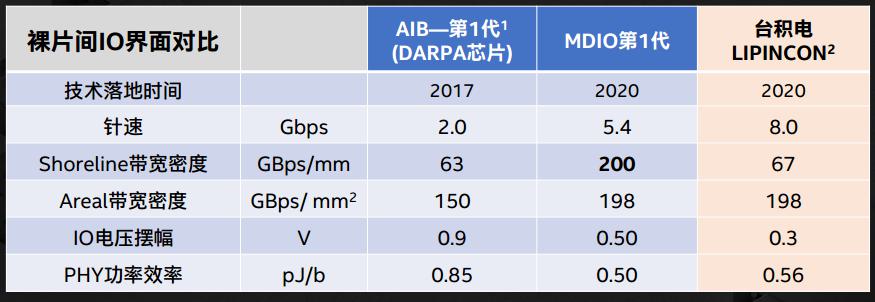在分析裸片間IO界面相關(guān)參數(shù)時(shí),Ravi Mahajan拿出了一張與臺(tái)積電對(duì)比的表格。2014年推出了AIB高級(jí)互連走線(xiàn)。每平方毫米Shoreline帶寬密度可以達(dá)到130,Areal帶寬密度可以達(dá)到150。同時(shí)針腳速度會(huì)達(dá)到2.0Gbps,物理層的能耗效率是0.85。臺(tái)積電LIPINCON2的針腳速度可以達(dá)到8.0,但是它的Shoreline帶寬密度和Areal帶寬密度分別是67和198。Ravi Mahajan表示:“英特爾可以在同樣的帶寬密度條件下在功耗上做得更低,這是我們?cè)趦?nèi)部測(cè)試所得出的結(jié)果,也是英特爾MDIO的第一代產(chǎn)品?!?