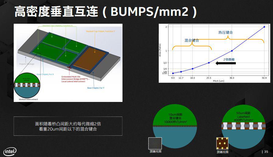 高密度3D封裝,將多芯片封裝從單獨(dú)一個(gè)平面,變?yōu)榱Ⅲw式組合,從而大大提高集成密度,可以更靈活地組合不同芯片或者功能模塊。Ravi Mahajan表示,現(xiàn)在其間距可做到50微米,英特爾已有先進(jìn)技術(shù)可將其做到10微米甚至更小,這取決于系統(tǒng)的設(shè)計(jì)方法,每平方毫米IO則可以從400到10000來(lái)進(jìn)行選擇。