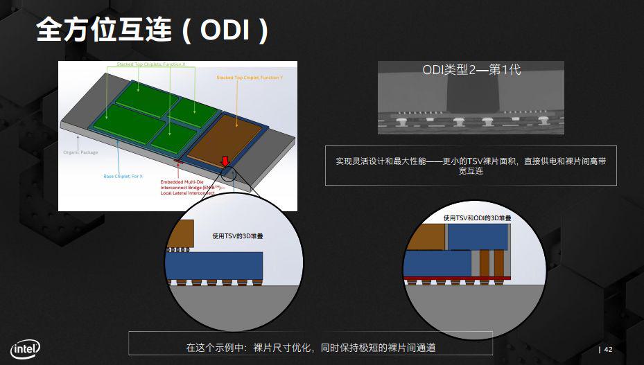 常規(guī)的疊加方式下,基礎(chǔ)裸片要大于上面疊加的所有小芯片的總和,通過(guò)ODI技術(shù)可以改變這一點(diǎn),使得兩者之間更好的協(xié)調(diào),上下做到面積統(tǒng)一。