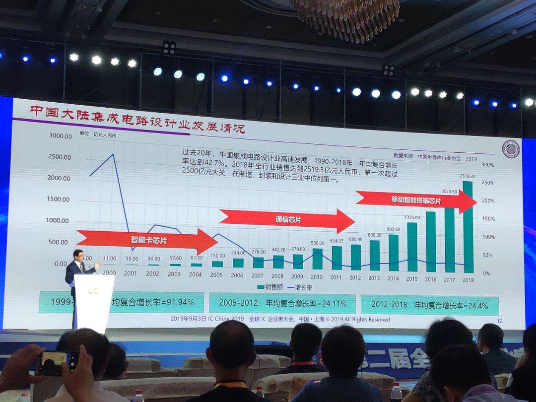 魏少軍先從中國集成電路產(chǎn)業(yè)數(shù)據(jù)角度闡述:2018年中國集成電路設(shè)計業(yè)銷售收入為2519.3億元,比2017年的2073.5億元增長21.5%,增速比上年的26.1%回落4.6個百分點。在全球集成電路設(shè)計業(yè)的占比將再次提高。2018年,中國集成電路產(chǎn)業(yè)各主要環(huán)節(jié)繼續(xù)維持兩位數(shù)的高速增長,設(shè)計業(yè)和制造業(yè)的增長率超過20%,但封測業(yè)增速回落到20%以下。其中,芯片制造業(yè)增速最高達(dá)到25.6%;設(shè)計業(yè)位列第二為21.5%。封測業(yè)銷售額第一次超過2000億元。