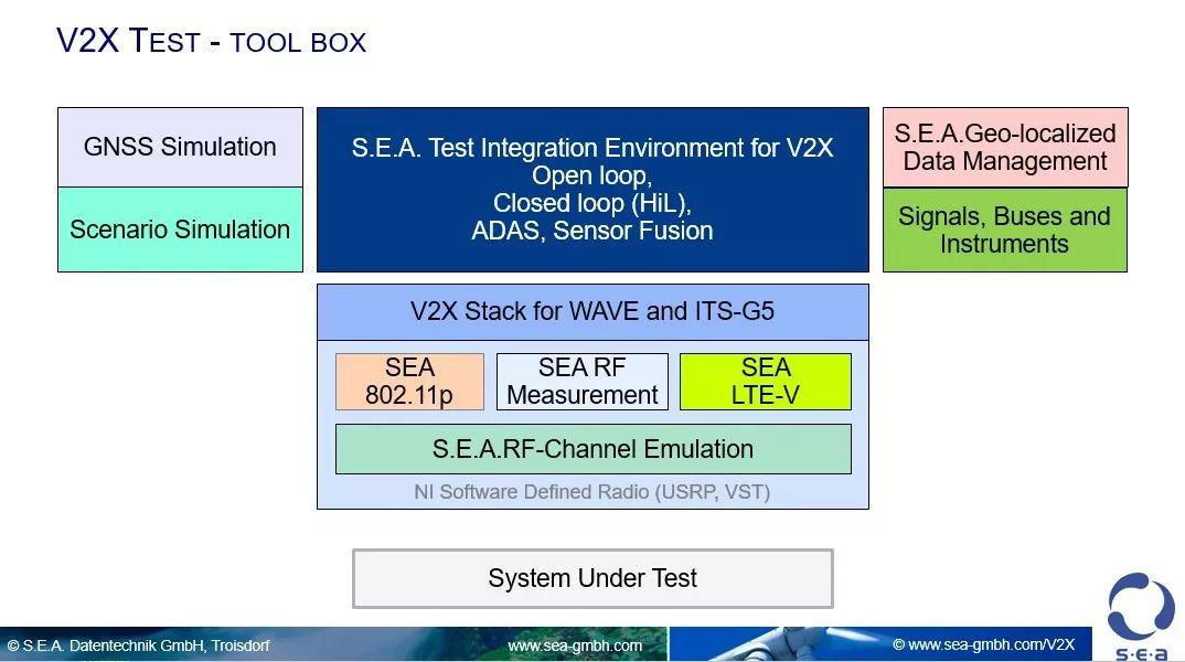 在2019汽車測試博覽會(ATE 2019)同期,NI發(fā)布了S.E.A. C-V2X(Cellular Vehicle-to-Everything)開環(huán)測試系統(tǒng),該系統(tǒng)是NI與德國S.E.A.公司合作,采用NI軟件無線電(SDR)硬件,結(jié)合S.E.A公司軟件,可將實際信號發(fā)送到C-V2X控制器和遠程信息處理控制單元上的射頻與GNSS通道。