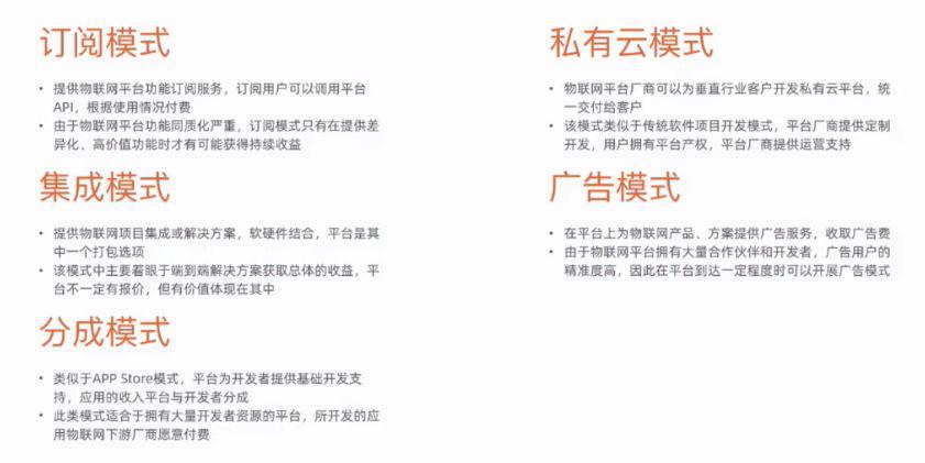 此外,續(xù)合元還表示,商業(yè)模式是當(dāng)前物聯(lián)網(wǎng)平臺(tái)最大痛點(diǎn)之一,不同類型平臺(tái)借助資深資源形成一些商業(yè)模式,大部分平臺(tái)處于長(zhǎng)期虧損狀態(tài),未來(lái)可持續(xù)的商業(yè)模式需要跨越盈虧觀點(diǎn)。