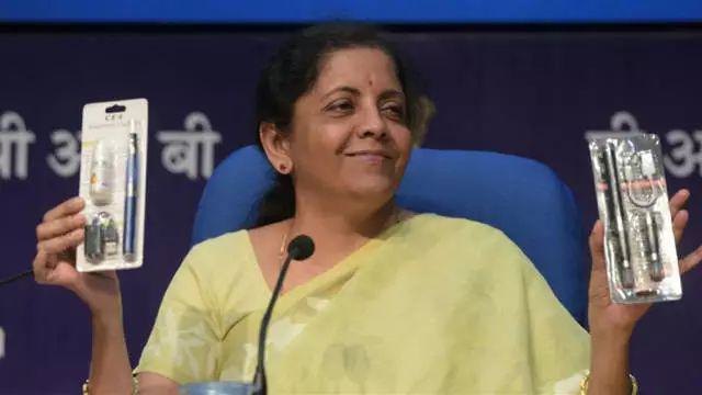 印度財(cái)政部長西塔拉曼在發(fā)布會(huì)上向媒體展示電子煙產(chǎn)品