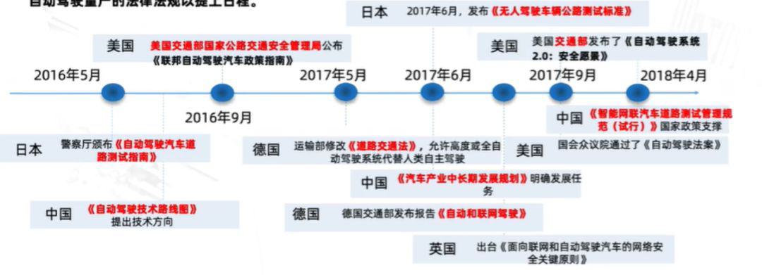 法規(guī)政策方面,從國際上來看:美、歐、日等發(fā)達(dá)國家密集出臺自動駕駛相關(guān)的法規(guī)政策,2017年9月,美國通過了《自動駕駛法案》,標(biāo)志自動駕駛上路正式合法化。