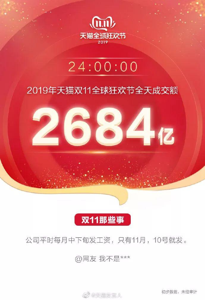 此外還有幾個關(guān)鍵數(shù)據(jù),1時26分07秒,1207億,打破2016年天貓雙11全天交易額紀(jì)錄。截止上午10時4分49秒,成交額超1682億元,超2017年雙11全天成交額。16時31分12秒達(dá)2135億,打破2018年天貓雙11全天交易額紀(jì)錄。最終數(shù)據(jù)顯示,2019年天貓雙11全球狂歡節(jié)全天成交額達(dá)到2684億元。喜報的底色被每位剁手黨手腕處流出的血染成鮮紅。