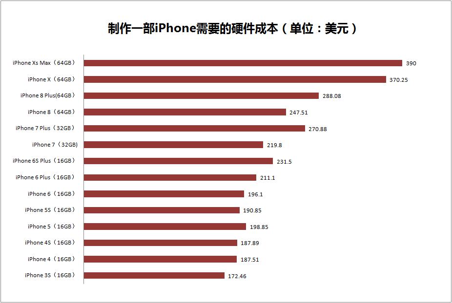 由于定價(jià)高,利潤高,蘋果手機(jī)的成本常常是人們熱議的話題。因此,蘋果手機(jī)一經(jīng)發(fā)布,總逃不了被拆解的命運(yùn),總有那么一幫人勤勤懇懇、持之以恒地在為我們計(jì)算每一款蘋果手機(jī)的硬件成本。所以,如果從硬件占比來看,真正的性價(jià)比之王還數(shù)第一代iPhone手機(jī),據(jù)資料顯示,第一代iPhone成本高達(dá)230.65美元,但起售價(jià)僅為499美元,硬件成本占比高達(dá)46.2%。不過這也是iPhone史上唯一一例。隨后iPhone 3 的發(fā)布,iPhone手機(jī)的成本便降到了200美元以下,直到iPhone 6 plus成本才再次突破200美元。