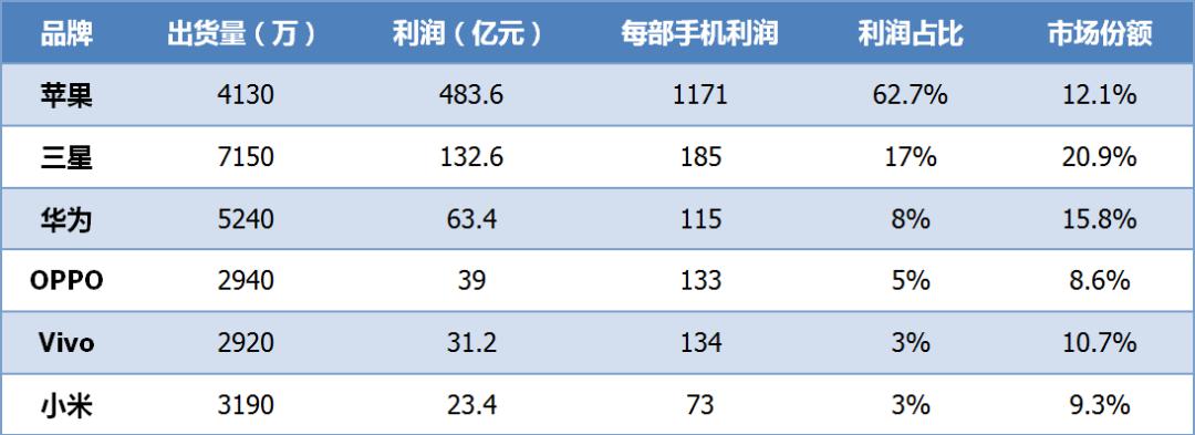 具體來看,每賣出一部手機(jī)蘋果可以獲得1171元的利潤,而三星只有185元,小米甚至不達(dá)百元。值得注意的是蘋果并不是市場(chǎng)份額最大的手機(jī)廠商。早在2017年蘋果智能手機(jī)占據(jù)全球市場(chǎng)份額為14.7%,但其利潤卻是全球智能手機(jī)整體利潤的86%,這樣看來,雖然近些年利潤占比有所下降,但是即便如此也遠(yuǎn)遠(yuǎn)勝過了其他廠商,甚至超過我國手機(jī)廠商的利潤之和。