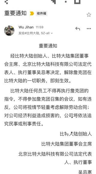 早在今年10月底,另一位比特大陸聯合創(chuàng)始人吳忌寒宣布回歸比特大陸,并通過內部郵件和員工大會的形式宣布解除原董事長詹克團的一切職務。郵件稱 “經比特大陸創(chuàng)始人、比特大陸集團董事會主席、北京比特大陸科技有限公司法定代表人、執(zhí)行董事吳忌寒決定,解除詹克團在比特大陸的一切職務,即刻生效?!?