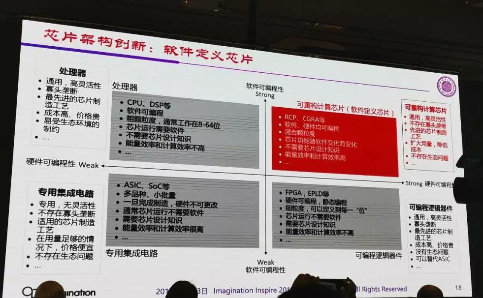 魏教授還提到,AI崛起的三大因素分別為算法、數(shù)據(jù)與算力,三者缺一不可。當前AI芯片發(fā)展重點為芯片架構(gòu)創(chuàng)新,即軟件定義芯片,可重構(gòu)計算芯片具有更高的靈活性。