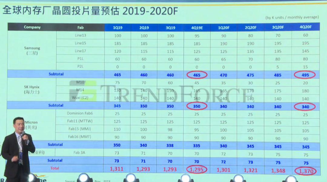 從全球內(nèi)存廠2020年產(chǎn)出量年成長(zhǎng)預(yù)估來(lái)看,2019年三星和SK海力士同比增長(zhǎng)都超過(guò)20%,明年只剩10來(lái)個(gè)點(diǎn),背后因?yàn)橘Y本支出的減少。SK海力士由于今年轉(zhuǎn)向1x nm制程,所以明年增長(zhǎng)幅度最大。(如下圖)