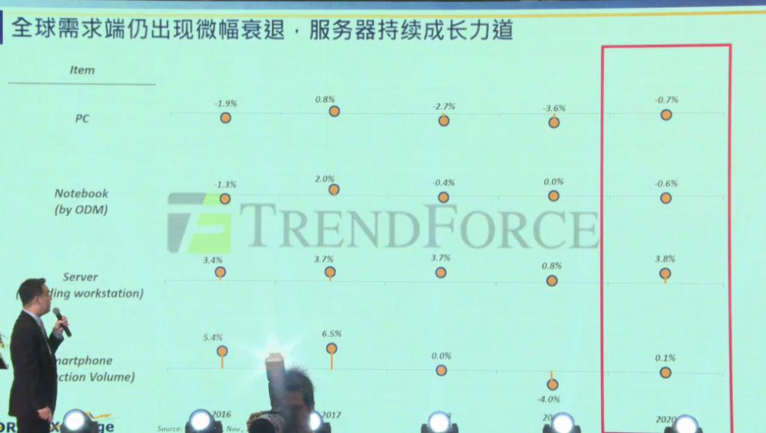 從需求側(cè)分析,與上面所說(shuō)一樣,整體出現(xiàn)微幅縮減,而服務(wù)器還在持續(xù)增長(zhǎng)。智能手機(jī)端今年下降了4%,郭祚榮稱(chēng)用戶(hù)都在期待5G手機(jī),明年智能手機(jī)端內(nèi)存市場(chǎng)將大概與今年持平。(如下圖)