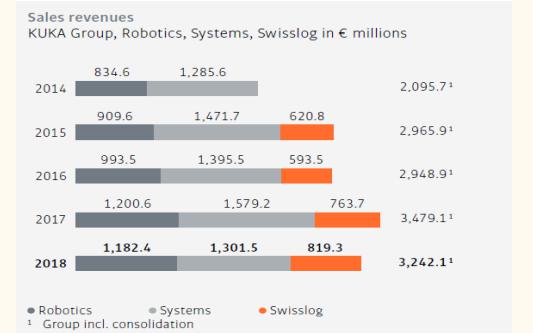從各項業(yè)務(wù)來看,系統(tǒng)集成業(yè)務(wù)占比一直較高。2018年,庫卡的系統(tǒng)集成業(yè)務(wù)占收入的40.14%。