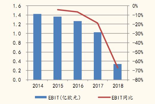 2018 年,庫卡營收 32.42 億歐元,同比下滑 6.81%。EBIT0.34 億歐元,同比下滑 67%。此次大幅下滑,主要是系統(tǒng)集成及瑞仕格業(yè)務(wù)虧損導(dǎo)致。
