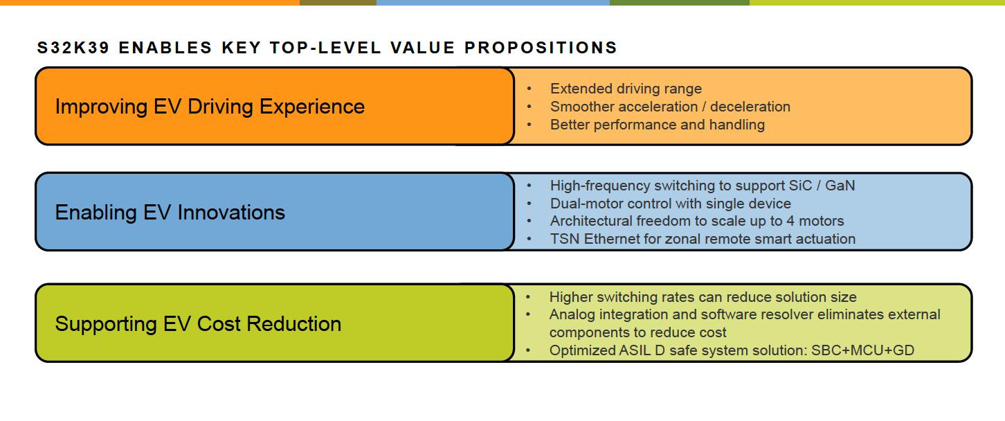 恩智浦S32K39系列微控制器是集性能、集成、網(wǎng)絡(luò)、信息安全和功能安全于一體,通過時(shí)間敏感網(wǎng)絡(luò)(TSN)以太網(wǎng)支持邊緣智能驅(qū)動(dòng)應(yīng)用,在這個(gè)過程中,通過NXP的模擬外設(shè)集成,可以顯著地降低系統(tǒng)成本,并實(shí)現(xiàn)ASIL D最高的安全水平。和之前的K37相比,S32K39的主要區(qū)別就在于增加了雙電機(jī)控制協(xié)處理器。