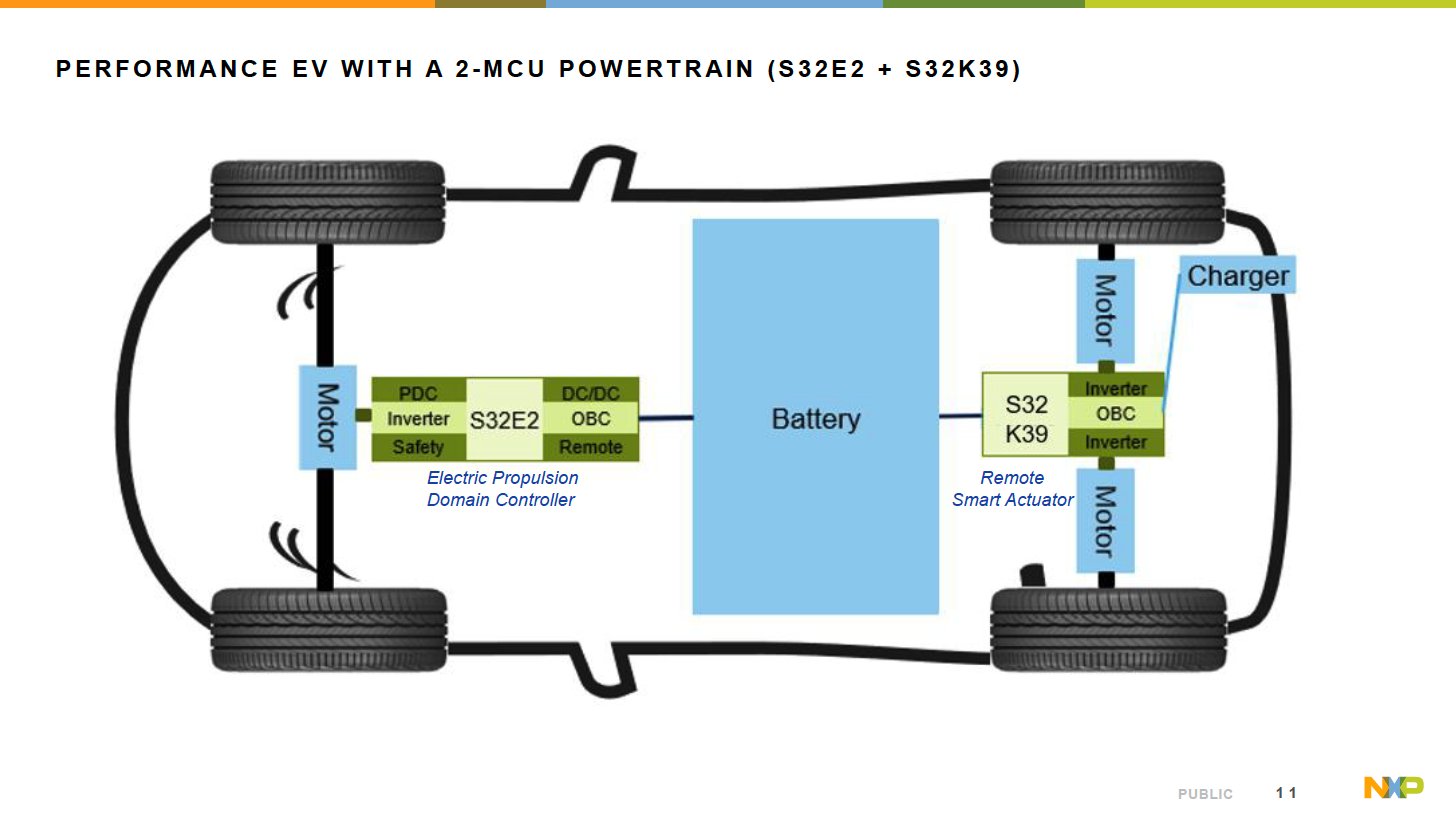如下圖所示,在汽車中S32E2和S32K39相互間可以進(jìn)行良好的協(xié)作。在前端S32E2可以對(duì)電機(jī)進(jìn)行控制,后端S32K39可以對(duì)兩臺(tái)電機(jī)進(jìn)行控制。得益于S32E可以實(shí)現(xiàn)雙電機(jī)控制的特性,所以雖然只有三個(gè)電機(jī),但仍可以實(shí)現(xiàn)四輪驅(qū)動(dòng)。