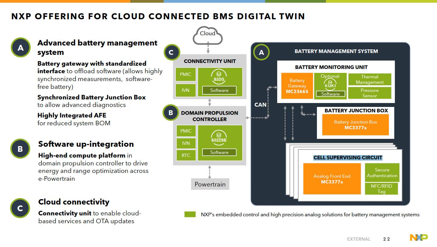 NXP的云孿生BMS方案由S32G GoldBox和高壓BMS參考設(shè)計(jì)兩部分組成,S32G GoldBox提供到云端的連接以及人工智能的驅(qū)動(dòng),HV-BMS負(fù)責(zé)電池的信息監(jiān)控和采集,云端的數(shù)字模型方面,NXP與Electra Vehicles合作采用其云端算法進(jìn)行建模和仿真。