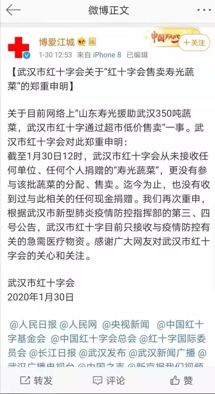 1月30日,武漢市紅十字會官方微博還發(fā)文稱:關(guān)于目前網(wǎng)絡(luò)上“山東壽光援助武漢350噸蔬菜,武漢市紅十字通過超市低價售賣”一事。武漢市紅十字會對此鄭重申明:截至1月30日12時,武漢市紅十字會從未接收任何單位、任何個人捐贈的“壽光蔬菜”,更沒有參與該批蔬菜的分配、售賣。