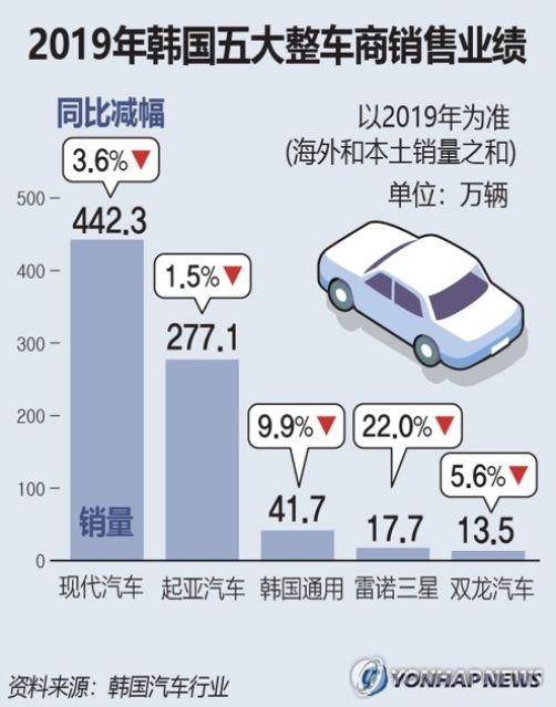 最近韓國各大車企2日公布的銷售數(shù)據(jù),現(xiàn)代汽車、起亞汽車、韓國通用、雷諾三星、雙龍汽車五大整車廠商2月全球銷量同比下滑11%,為50.5212萬輛,創(chuàng)11年來新低