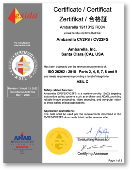 安霸 CV2FS/CV22FS 榮獲 ASIL C 芯片功能安全認(rèn)證,超越市場同類芯片水平