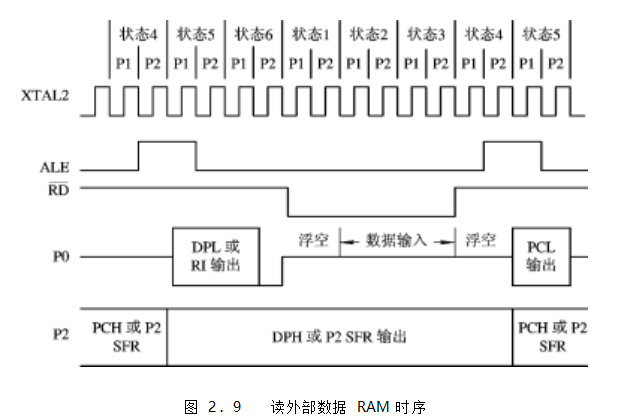 訪問外部數(shù)據(jù) RAM 時(shí),使用的控制信號(hào)有 ALE 和RD(讀) 或WR(寫),P0 和 P2 口仍然要用,作為傳送 RAM 地址線和讀寫數(shù)據(jù)線。讀外部數(shù)據(jù) RAM 的 時(shí)序如 圖 2.9 所示, 其過程如下: