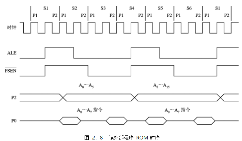 如果指令是從外部 ROM 中讀取 ,除 了 ALE 信號(hào)之外,控制信號(hào)還有PSEN 。此外,還要用到 P0 和 P2 口,P0 口分時(shí)用做低 8 位地址和數(shù)據(jù)總線,P2 口用做高 8 位地址總 線。相應(yīng)的時(shí)序圖如圖 2.8 所示。