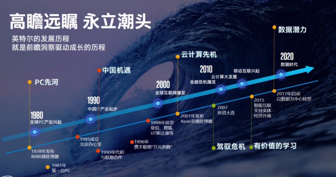 1978年的8086微處理器趕在全球PC產(chǎn)業(yè)興起前;落戶中國(guó)的1985年,比中國(guó)IT起步早了5年;互聯(lián)網(wǎng)爆發(fā)之際,趕緊掏出Xeon至強(qiáng)處理器;2017年又啟動(dòng)了數(shù)據(jù)為中心的轉(zhuǎn)型。