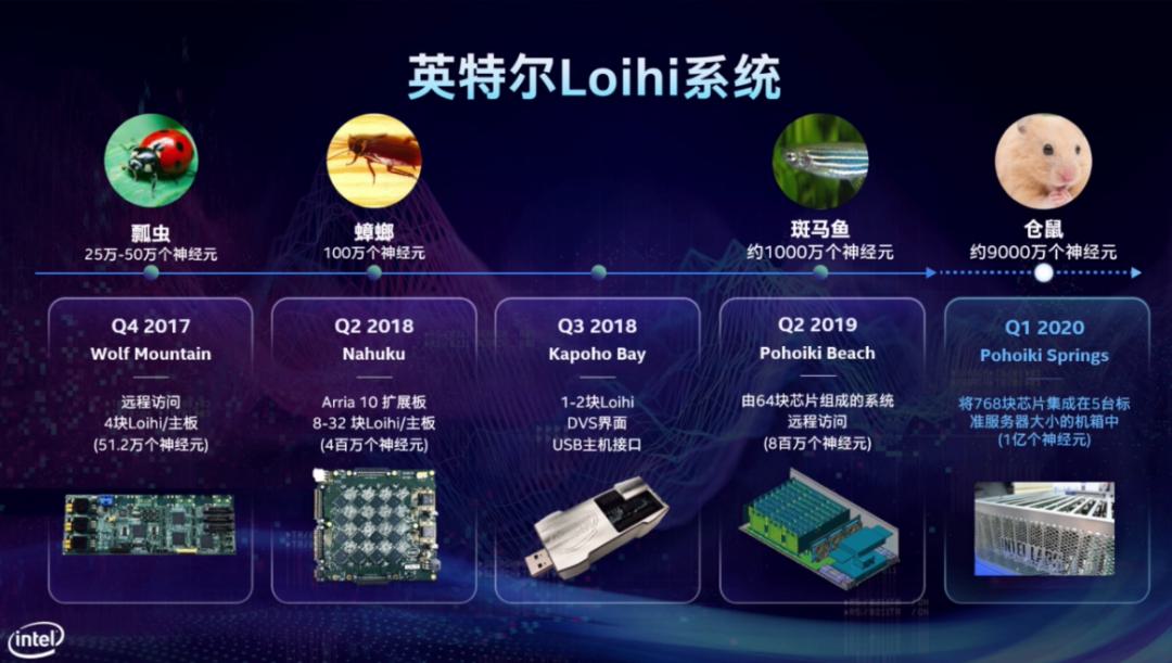 其中英特爾開(kāi)發(fā)的代號(hào)為L(zhǎng)oihi的首款自主學(xué)習(xí)神經(jīng)擬態(tài)芯片。它帶來(lái)了一種新的微架構(gòu)方式,支持自主學(xué)習(xí),即使在應(yīng)用場(chǎng)景變化時(shí),也能通過(guò)自主學(xué)習(xí)來(lái)進(jìn)行適應(yīng)。英特爾最新的神經(jīng)擬態(tài)芯片——Pohoiki Springs,能提供1億個(gè)神經(jīng)元的計(jì)算能力,將Loihi的神經(jīng)容量增加到一個(gè)小型哺乳動(dòng)物大腦的大小,并且可以給很多很多合作伙伴提供云上的服務(wù)。