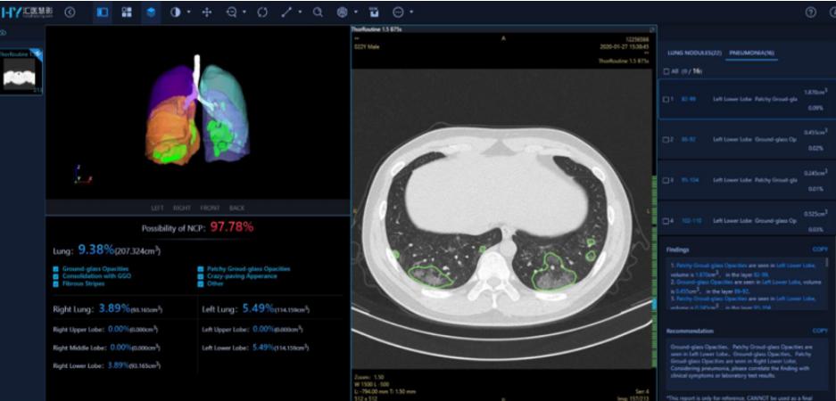 一家名為匯醫(yī)慧影的公司,收集大量新冠肺炎數(shù)據(jù),由專(zhuān)業(yè)醫(yī)生團(tuán)隊(duì)進(jìn)行精標(biāo)注,利用深度學(xué)習(xí)分割技術(shù),實(shí)現(xiàn)病灶快速識(shí)別和精準(zhǔn)測(cè)量,并且結(jié)合多模態(tài)數(shù)據(jù)實(shí)現(xiàn)肺炎的智能分類(lèi)。據(jù)悉,對(duì)于肺炎病灶的檢出率和準(zhǔn)確率達(dá)到96%;結(jié)合高效處理器和輕量級(jí)網(wǎng)絡(luò)模型等技術(shù),提升算法效率,500+幅CT影像20秒即可完成診斷。