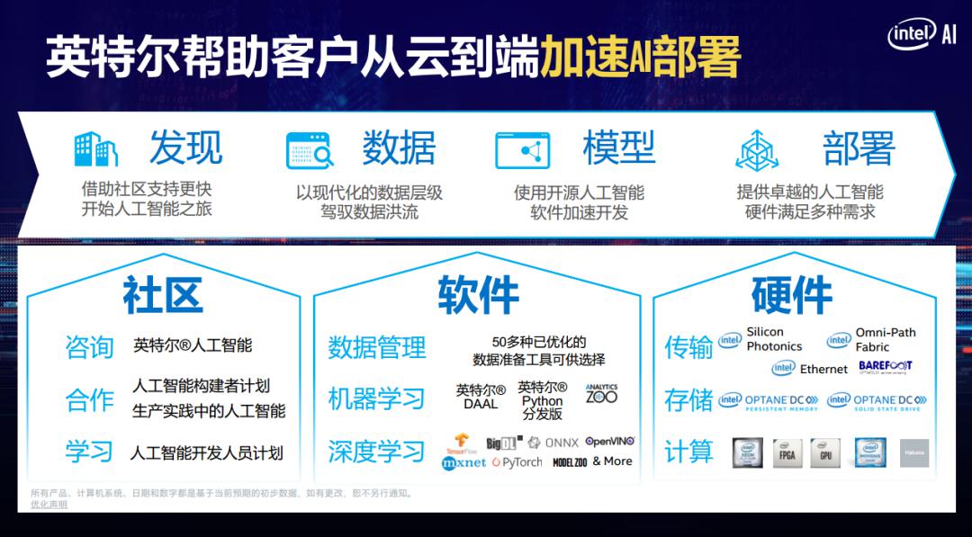 這背后也離不開(kāi)英特爾,通過(guò)在硬件層面提供更高性能的第二代至強(qiáng)可擴(kuò)展處理器,并在內(nèi)核中不斷引入AVX-512指令集、DL Boost人工智能加速指令集、DAAL高性能機(jī)器學(xué)習(xí)和數(shù)據(jù)分析庫(kù)、MKL-DNN數(shù)學(xué)核心函數(shù)庫(kù)、nGraph編譯器等進(jìn)行軟件優(yōu)化,使得整個(gè)處理器的AI推理性能成倍提升。同時(shí),通過(guò)傲騰數(shù)據(jù)中心級(jí)持久內(nèi)存,為用戶(hù)提供單盤(pán)高達(dá)512GB的容量和更優(yōu)成本,以支持更多的虛機(jī)和容器。