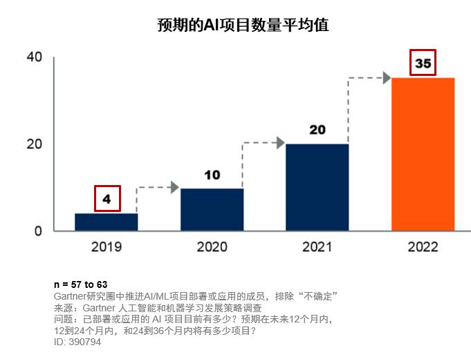 隨機(jī)找一位路人,問(wèn)他“這是怎樣的AI時(shí)代?”不管專(zhuān)業(yè)還是非專(zhuān)業(yè)人士,一定給你一個(gè)類(lèi)似“BOOM”的答案。這些年,說(shuō)一次AI天上就掉下一粒沙,于是有了撒哈拉。但一切又像處于行業(yè)爆發(fā)前夕,據(jù)Gartner調(diào)查研究顯示,如下圖,從事人工智能或機(jī)器學(xué)習(xí)工作的企業(yè)平均有4個(gè)AI/ML項(xiàng)目到位。59%的受訪者表示他們已經(jīng)部署了人工智能。