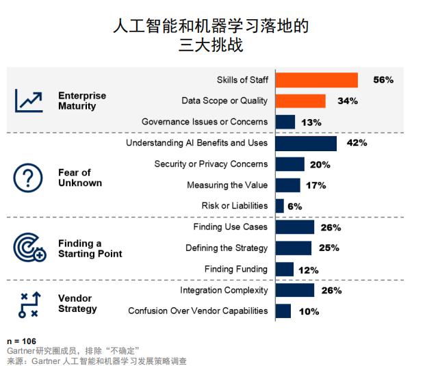 此外,Gartner這份調(diào)研還表示,目前這些企業(yè)在應(yīng)用人工智能和機(jī)器學(xué)習(xí)技術(shù)時(shí)面臨的如下圖顯示的三大挑戰(zhàn),其中首要解決的是員工技能、數(shù)據(jù)范圍和質(zhì)量以及AI優(yōu)勢(shì)的理解和應(yīng)用。團(tuán)隊(duì)技能和數(shù)據(jù)的可用性成了兩大壁壘。Jim Tung表示:“通過(guò)雇傭新的專(zhuān)家,能夠在一定程度上解決團(tuán)隊(duì)技能方面的問(wèn)題,但現(xiàn)有團(tuán)隊(duì)成員的技能也需要提高。這兩大壁壘對(duì)于AI技術(shù)的成功應(yīng)用十分重要,亟待解決。”