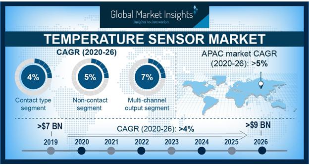 去年,全球溫度傳感器市場規(guī)模超過70億美元。如今疫情的突發(fā)是否是溫度傳感器市場爆發(fā)的一個契機?據(jù)Global Market Insights近日數(shù)據(jù)顯示,2019年全球溫度傳感器市場規(guī)模超過70億美元,估計從2020年至2026年將以4%的復合年增長率增長。市場增長的動力來自于汽車、醫(yī)療保健和制造業(yè)等,其對測量準確度和測量范圍有著非常高的要求。