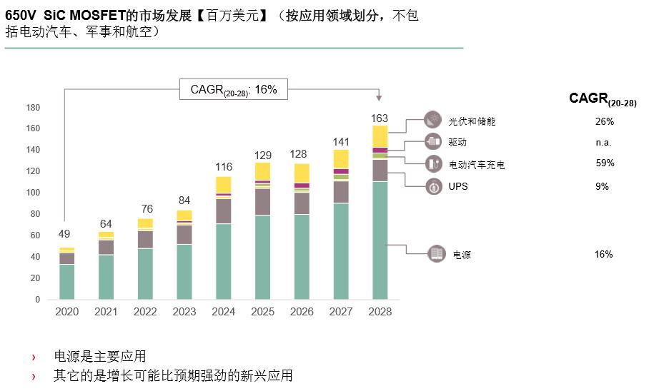 在近日的英飛凌650 V CoolSiC? MOSFET系列發(fā)布會上,英飛凌電源與傳感系統(tǒng)事業(yè)部大中華區(qū)開關電源應用高級市場經(jīng)理陳清源詳細介紹了CoolSiC系列新品以及對SiC市場的展望。根據(jù)IHS的預估,今年SiC將會占據(jù)近5000萬美元的市場份額,到2028年,其市場份額將達到1億6000萬美元,整個復合成長率也達到了16%。兩位數(shù)的復合成長率對于SiC來說相當可觀,也吸引了更多公司參與其研發(fā)之列,英飛凌便是其中之一。在近日的英飛凌650 V CoolSiC? MOSFET系列發(fā)布會上,英飛凌電源與傳感系統(tǒng)事業(yè)部大中華區(qū)開關電源應用高級市場經(jīng)理陳清源詳細介紹了CoolSiC系列新品以及對SiC市場的展望。