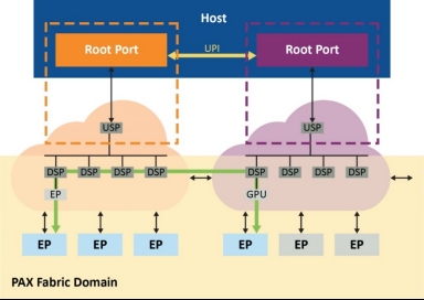 這種PAX結(jié)構(gòu)交換網(wǎng)解決方案還支持在各結(jié)構(gòu)之間直接跨域點(diǎn)對(duì)點(diǎn)傳輸,因此可減少根端口阻塞并進(jìn)一步緩解CPU性能瓶頸,如圖4所示。