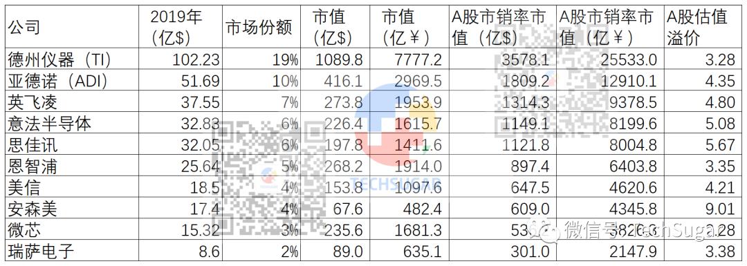 如果以35倍市銷率來計算這些公司的市值,會是怎樣一個狀況?如上表所示,基本上市值都有五倍左右的空間,除了德州儀器本身因為體量大,所以只有3倍外,其余低于四倍的恩智浦、微芯和瑞薩電子都是因為模擬業(yè)務(wù)占總銷售額比例較低導(dǎo)致,2019財年,恩智浦、微芯和瑞薩電子的營收分別為88.77億美元、53.5億美元和9569.8億日元(折合約88.9億美元),如果以全部營收來算市銷率,顯然也都在五倍以上。尤其是安森美,竟然有9倍,不來A股顯然虧大了。
