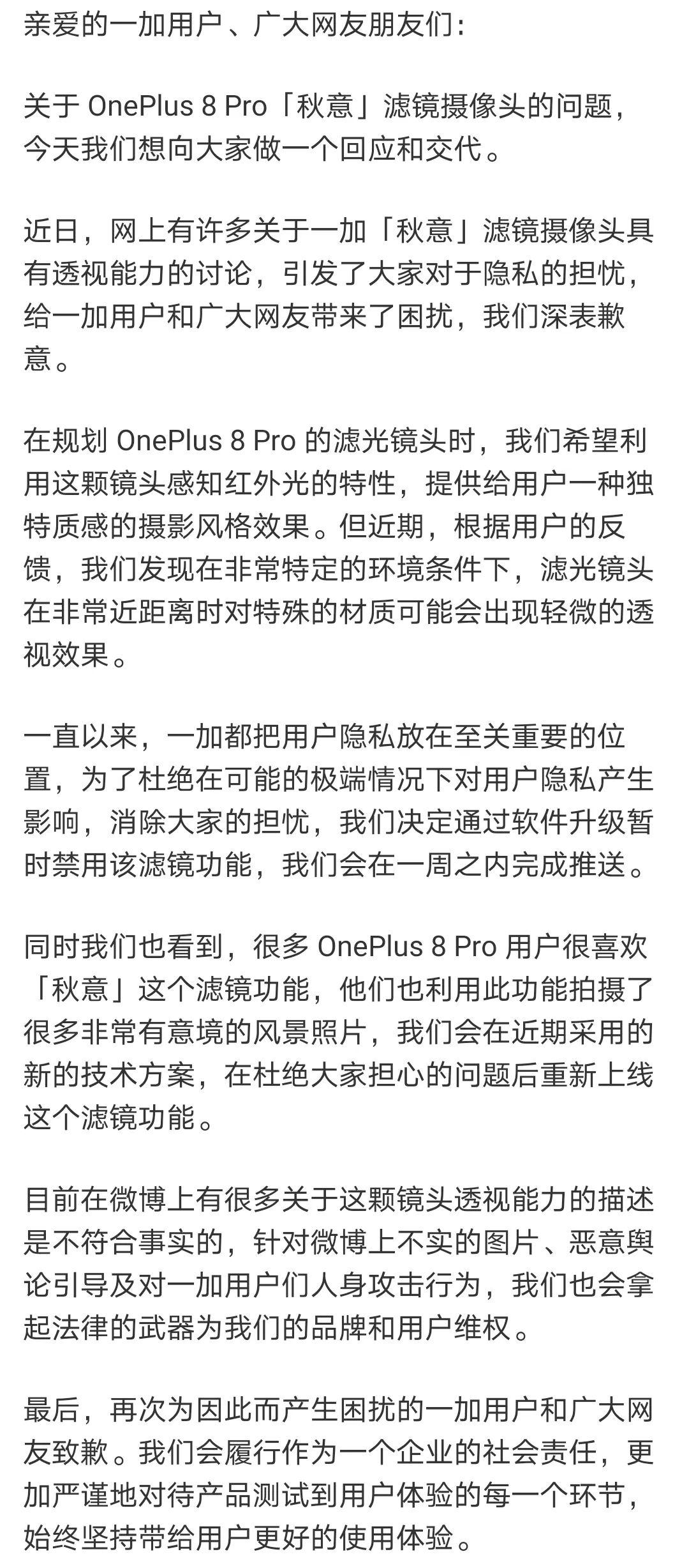 “轟轟烈烈”的并不是紅外攝像技術(shù),而是對于隱私安全性的思考。近日,一加手機因隱私問題登上微博熱搜,有網(wǎng)友反應(yīng),OnePlus 8 Pro的“秋意”濾鏡具有透視能力。隨后一加作出回應(yīng),表示在規(guī)劃OnePlus 8 Pro的濾光鏡頭時,希望利用這顆鏡頭感知紅外光的特性,提供給用戶一種獨特質(zhì)感的攝影風格效果。但近期,根據(jù)用戶的反饋,發(fā)現(xiàn)在非常特定的環(huán)境條件下,濾光鏡頭在非常近距離時對特殊的材質(zhì)可能會出現(xiàn)輕微的透視效果。為了消除消費者的擔憂,一加決定通過軟件升級暫時禁用該濾鏡功能。