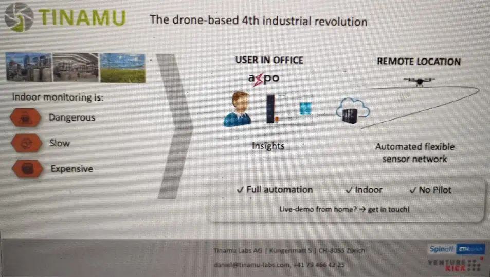 另一家衍生于蘇黎世聯(lián)邦理工的機器人初創(chuàng)公司Tinamu則聚焦無人機功能原型。Tinamu把連通云端的無人機變?yōu)殪`活的傳感器網(wǎng)絡(luò),可在所有環(huán)境,包括室內(nèi)實現(xiàn)檢查工作流程和數(shù)據(jù)采集自動化。他們的解決方案包括用戶界面(儀表板)、分析軟件(支持專有和第三方軟件)以及遠(yuǎn)程無人機系統(tǒng)。用戶可在總部就可遠(yuǎn)程啟動無人機,無人機就可在遠(yuǎn)程位置進(jìn)行工作,獲取數(shù)據(jù)后,再在云端分析處理數(shù)據(jù),并將信息返回給用戶。