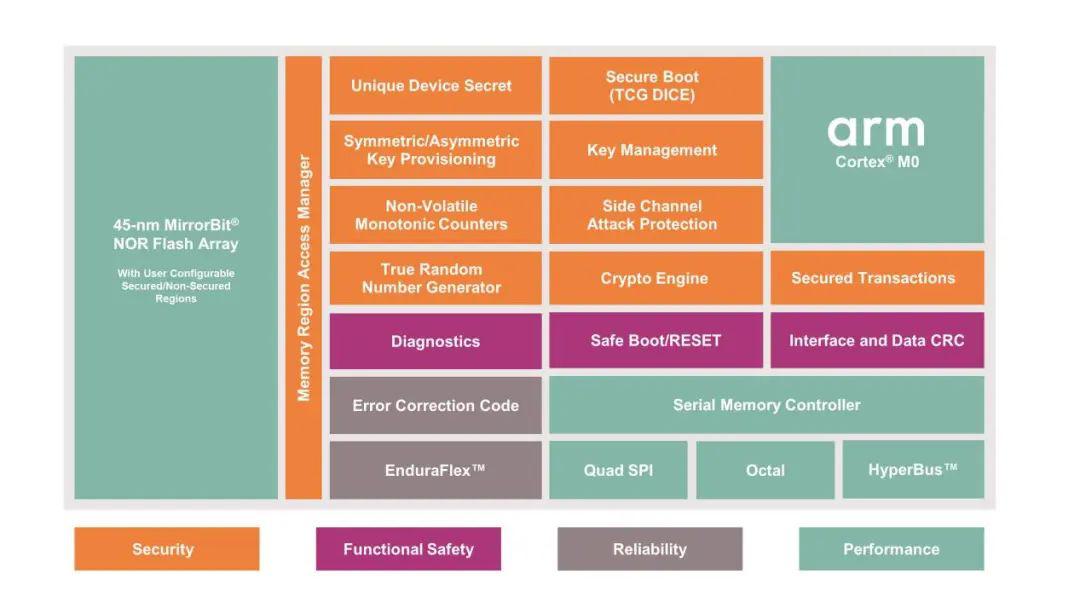 據(jù)黃睿介紹,賽普拉斯(英飛凌)的Semper Nano家族采用了NOR Flash行業(yè)領(lǐng)先的45nm MirrorBit工藝,是業(yè)內(nèi)面積最小的256Mb NOR型閃存,可針對(duì)藍(lán)牙耳機(jī)、可穿戴市場(chǎng)提供更優(yōu)質(zhì)的性能和更低的功耗。