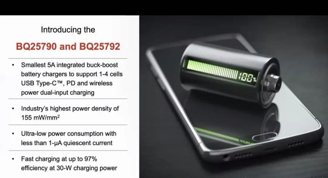 Samuel介紹了德州儀器新發(fā)布的升降壓的充電器BQ25790和BQ25792,可以支持5A充電1到4節(jié)的充電電池,可以適配USB,同時(shí)可以支持無(wú)線充電輸入。它將傳統(tǒng)的5W到10W的輸入端口提升到了100W,可以給更多種的應(yīng)用來(lái)提供更大的功率進(jìn)行充電,可以工作在降壓模式、降壓模式或者升降壓模式。
