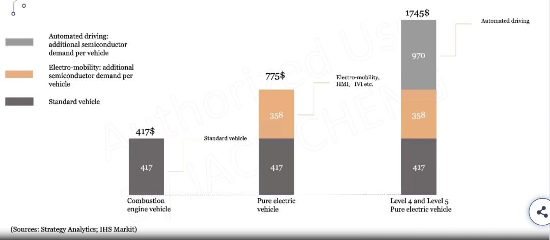 鄭顯聰預(yù)計,每輛車半導(dǎo)體成本會上升到1700美元?,F(xiàn)在的汽油車大約417美元,當升級成純電車后,成本會增長到775美元,這還不包括自動駕駛和智能網(wǎng)聯(lián)等功能,僅電動化還不足以造成較大增長,而當完成最后L4和L5升級完成會達到1745美元。