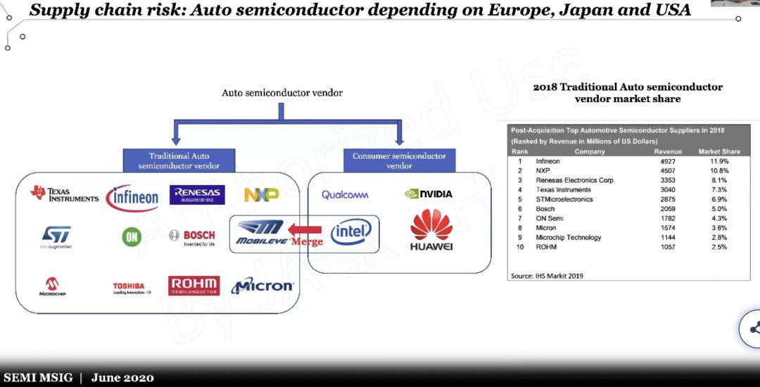 關(guān)于產(chǎn)業(yè)鏈方面,歐洲、日本和美國壟斷了絕大部分傳統(tǒng)汽車半導(dǎo)體產(chǎn)業(yè)。德州儀器、英飛凌等傳統(tǒng)汽車半導(dǎo)體龍頭產(chǎn)業(yè),而華為、高通和英偉達等是本來做手機和消費品,他們成為新人玩家。從數(shù)據(jù)中可以看出,英飛凌等都占據(jù)一定份額,而當華為等進入后,這一池清水肯定會被攪亂,又得重新洗牌,很可能這四位新手玩家進入前十名,這會有比較大的轉(zhuǎn)變。